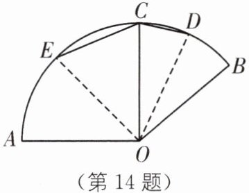 14 如图,已知$∠AOB= 140^{\circ}$,若将OA、OB向内折叠使得点A、B落在圆弧上的同一点C处,折痕为OE、OD,求$∠ECD$的度数.