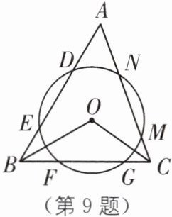 9 如图,$\odot O在△ABC$三边上截得的弦长相等,即$DE= FG= MN,∠A= 50^{\circ }$,则$∠BOC$为( ).