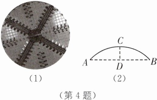 4 新情境 泥水平衡盾构机 (2024·南京建邺区期中)根据江心洲地质水文条件量身打造的“新时代号”泥水平衡盾构机,是目前世界上最先进的盾构设备之一,被誉为“国之重器”.如图(1),盾构机核心部件——刀盘的形状是一个圆形.如图(2),当机器暂停时,刀盘露在地上部分的跨度$AB= 12m$,拱高(弧的中点到弦的距离CD)3m,求盾构机刀盘的半径.