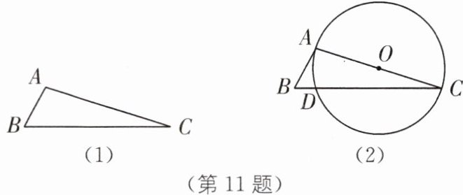 (2)如图(2),$∠B>45^{\circ }$,以边AC为直径作$\odot O$,交BC于点D,若$BD= 2,BC= 7$,试求$\odot O$的面积.