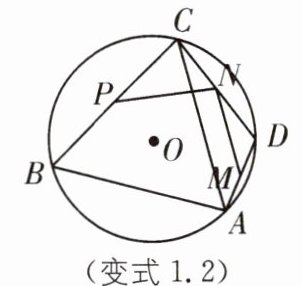 变式1.2 如图,AB、BC是以O为圆心,半径为4的圆的两条弦,$∠B= 60^{\circ }$,且点O在$∠B$内,则$AC= $____,若点D是劣弧AC上的一个动点,点M、N、P分别是AD、CD、BC的中点.则$PN+MN$的长度的最大值为____.