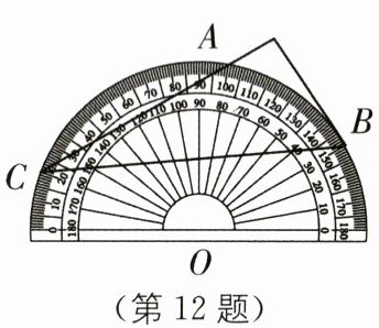 12. 将量角器按如图所示的方式放置在三角形纸板上,使顶点C在半圆上,点A、B的读数分别为$100^{\circ }$、$150^{\circ }$,则$∠ACB$的大小为______$^{\circ }$.