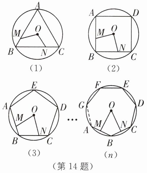 14 中考新考法 类比探究 如图(1)、(2)、(3)、…、(n),M、N分别是⊙O的内接正三角形ABC、正方形ABCD、正五边形ABCDE、…、正n边形ABCDE…的边AB、BC上的点,且BM= CN,连接OM、ON。