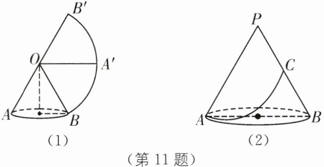 (1)120 60 [解析]由题意,得扇形OBB'的弧长等于圆锥底面圆的周长,即$\frac{n\pi l}{180}=2\pi r$,即$n=\frac{360r}{l}$.