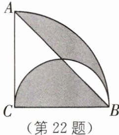22 如图,在圆心角为$90^{\circ}$的扇形ACB内,以BC为直径作半圆,连接AB。若阴影部分的面积为$(π-1)$,则$AC= $____。