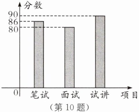 10 (2024·德阳中考)某校拟招聘一名优秀的数学教师,设置了笔试、面试、试讲三项水平测试,综合成绩按照笔试占30%,面试占30%,试讲占40%进行计算,小徐的三项测试成绩如图所示,则她的综合成绩为