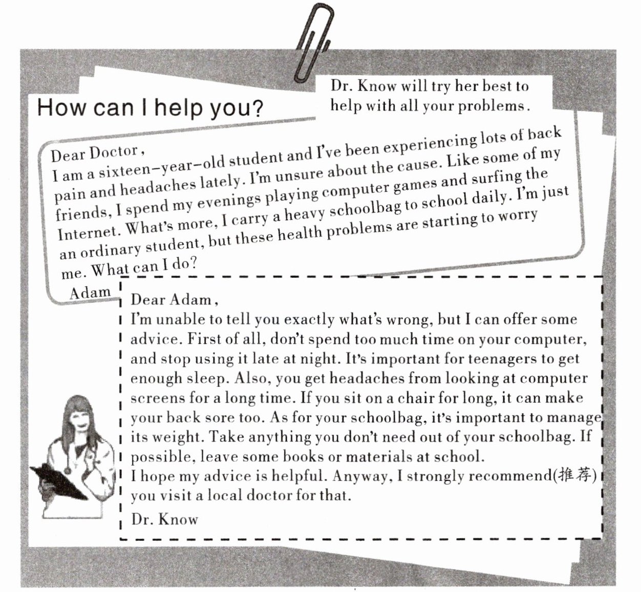 1. D [解析]推理判断题。根据第一封信中“I am a sixteen-year-old student and I've been experiencing lots of back pain and headaches lately.”和“I'm just an ordinary student,but these health problems are starting to worry me.”可知,Adam 对自己的健康问题充满了担忧。故选 D。 2. A [解析]细节理解题。根据第二封信中“I hope my advice is helpful. Anyway,I strongly recommend(推荐)you visit a local doctor for that.”可知,Dr. Know 建议 Adam 去看当地的医生。故选 A。 3. C [解析]推理判断题。本文展示了两封信:第一封是学生 Adam 写给 Dr. Know 的求助信,另一封是 Dr. Know 的回信。这最有可能出现在报纸上的“青少年的生活”版块。故选 C。