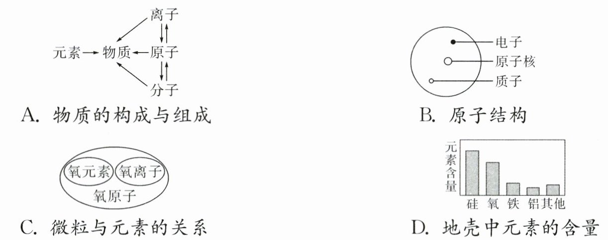 A [解析]宏观上物质是由元素组成的,微观上物质是由分子、原子或离子构成的,分子可以分裂成原子,原子可以构成分子,原子得失电子变成离子,离子通过电子的得失可变回原子,A正确;原子核由质子和中子构成,模型中质子不在原子核内,B错误;氧离子和氧原子都属于氧元素,C错误;地壳中元素含量排在前四位的依次是氧、硅、铝、铁,D错误。技法点拨 模型法模型法是指借助模型直观反映原型本质,将抽象的问题直观化、具体化的方法。化学学习中常采用模型法,从宏观、微观和符号三个层次上认识物质及其变化并建立它们之间的联系,可以说模型是联系宏观与微观的桥梁,是把微观问题宏观化的最常用方法。