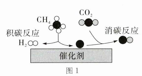 15. 甲烷$(CH_4)$与二氧化碳$(CO_2)$在催化剂作用下可得到合成气一氧化碳(CO)和氢气$(H_2),$反应过程中催化剂表面还同时存在积碳反应和消碳反应,原理如图所示。下列说法错误的是( )。