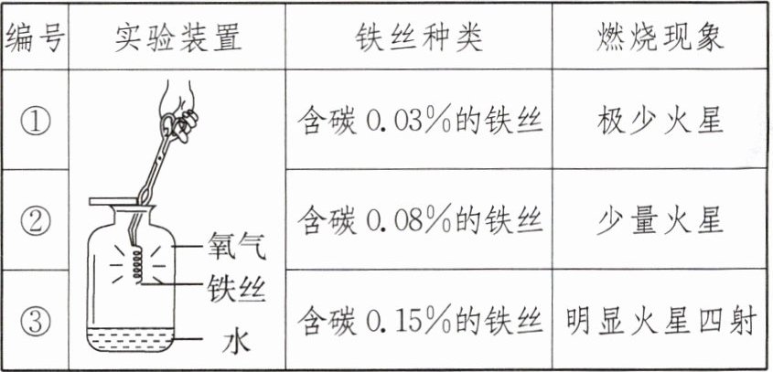 D [解析]实验①②③所用铁丝均含有碳,均属于混合物,A正确;实验前铁丝需要用砂纸打磨,以除去铁丝表面氧化物及污物,防止影响实验,B正确;由表格数据可知,不同含碳量的铁丝燃烧的现象不同,且含碳量越高现象越明显,说明火星四射可能与铁丝中的碳和氧气反应有关,C正确;由表格数据可知,燃烧含碳 0.08%的铁丝能观察到少量火星,燃烧含碳0.15%的铁丝能观察到明显火星四射,则铁丝中碳含量为0.05%时实验现象不可能为明显的火星四射,D错误。