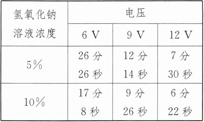 (5)根据表格中的数据可知,实验中有两个变量,分别是氢氧化钠溶液的浓度和电压,该实验的目的是探究氢氧化钠溶液浓度和电压对电解水速率的影响。