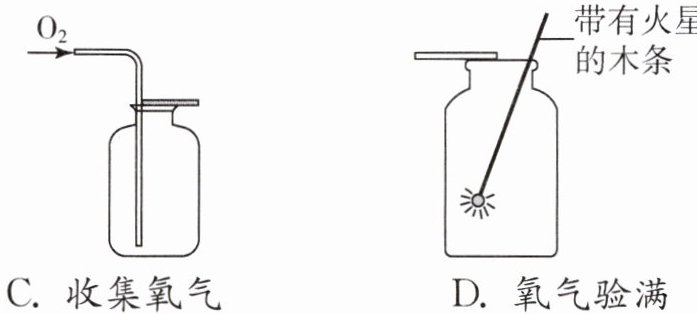 C [解析]取用粉末状试剂时,试管倾斜(或平放),用药匙或纸槽把试剂送到试管底部,然后使试管直立起来,A错误;给试管中的固体加热时,防止冷凝水倒流炸裂试管,试管口应略向下倾斜,B错误;氧气的密度比空气的大,应用向上排空气法收集,C正确;检验氧气是否收集满时,应将带火星的木条放在集气瓶口,不能伸入瓶中,D错误。