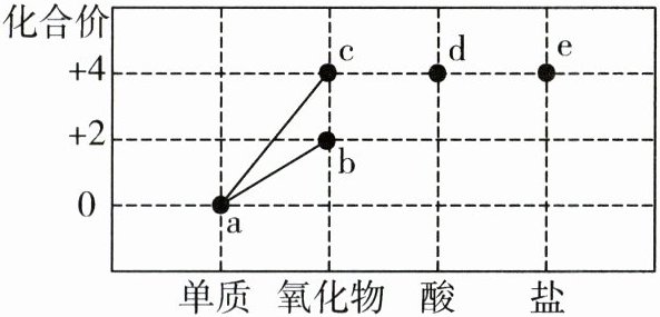 D [解析]a点表示碳单质,碳元素的化合价为0,因此可能是C₆₀,A正确;b为一氧化碳,c为二氧化碳,一氧化碳与氧气反应得到二氧化碳,二氧化碳与碳高温下反应得到一氧化碳,可以相互转化,B正确;c为二氧化碳,d是碳酸,二氧化碳与水反应可以生成碳酸,因此c能与水反应生成d,C正确;e是碳酸盐,二氧化碳与氢氧化钠反应得到碳酸钠和水,因此c可以直接转化成e,D错误。