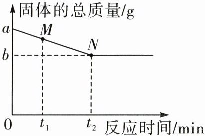 C [解析]碳和氧化铁在高温条件下反应生成铁和二氧化碳,M点时还未完全反应,此时对应的固体物质有氧化铁、碳、铁三种,A错误;N点时,恰好完全反应,此时固体为铁粉,颜色为黑色,B错误;根据质量守恒定律,化学反应前后,物质的总质量不变,故反应后产生气体的总质量为(a-b)g,C正确;碳和氧化铁在高温下反应生成铁和二氧化碳,根据质量守恒定律,化学反应前后,元素的种类和质量不变,故铁元素的质量不变,但是0~t₂ min内,固体的总质量减少,故固体中铁元素的质量分数增大,D错误。