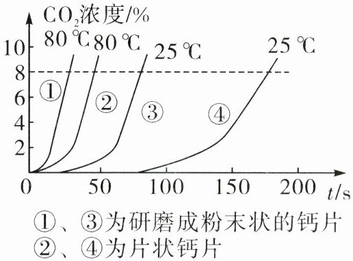 14. 中考新考法 数字化实验 某兴趣小组为探究影响化学反应速率的因素,使用等量的同种钙片和白醋开展四组实验,分别测得产生的二氧化碳浓度随时间的变化曲线如图所示。选取$CO_2$的浓度从0~8%为研究对象,下列实验结果分析错误的是(