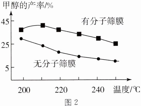 (2)对比图2中两条曲线,得出的结论:在一定条件下,200~250℃范围内,有分子筛膜时甲醇的产率比无分子筛膜时的高。