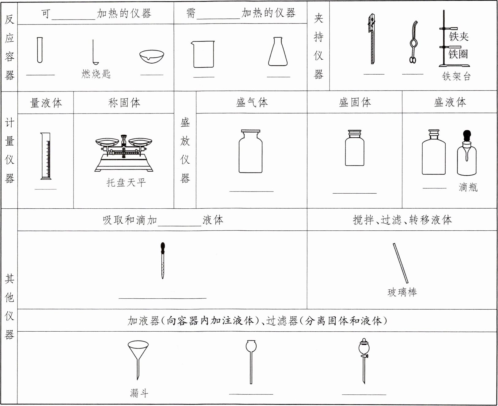 铁架台||计量仪器|量液体|称固体|盛放仪器|盛气体|盛固体|盛液体|