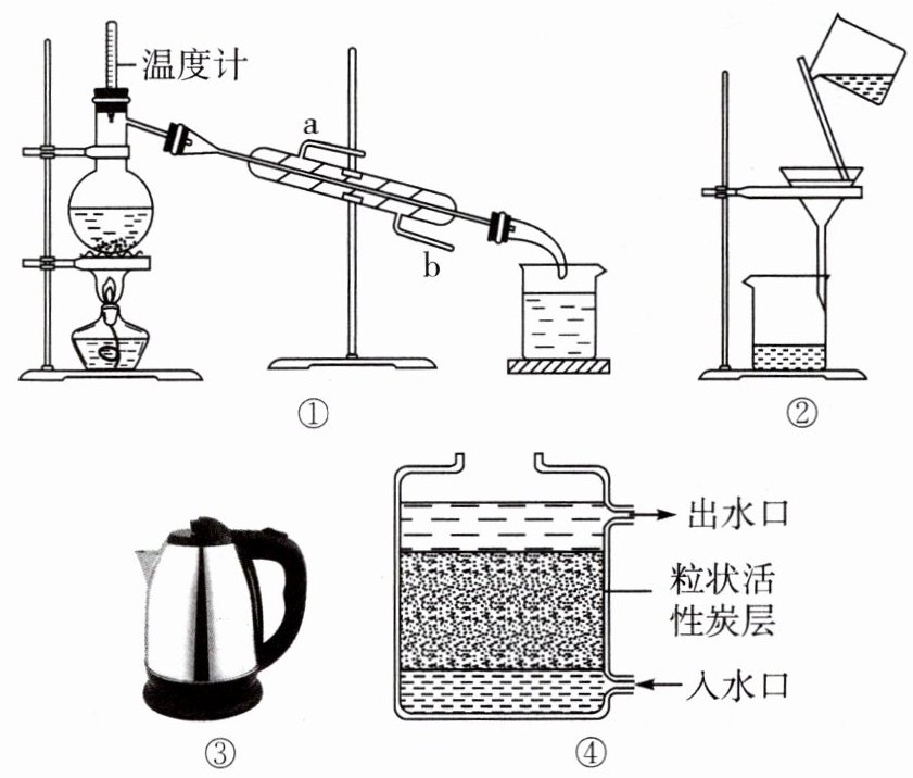 D 解析 图①中冷凝水应从 b 口进,a 口出,这样冷凝比较充分,A 正确;图②是过滤,过滤时滤液要低于滤纸边缘,B 正确;高温能杀死水中的细菌,煮沸是生活中对饮用水杀菌消毒的主要方法,C 正确;①是蒸馏,蒸馏几乎可除去所有杂质,可得到纯净水,②③④只能除去水中的部分杂质,无法得到纯净水,D 错误。