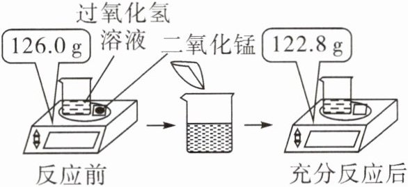 (2)解:设过氧化氢的质量为x。2H₂O₂$\frac{\underline{\text{MnO}_2}}{}$2H₂O+O₂↑ 68 32 x 3.2 g $\frac{68}{32}$=$\frac{x}{3.2\,\text{g}}$ x=6.8 g 答:此过氧化氢溶液中过氧化氢的质量为6.8 g。