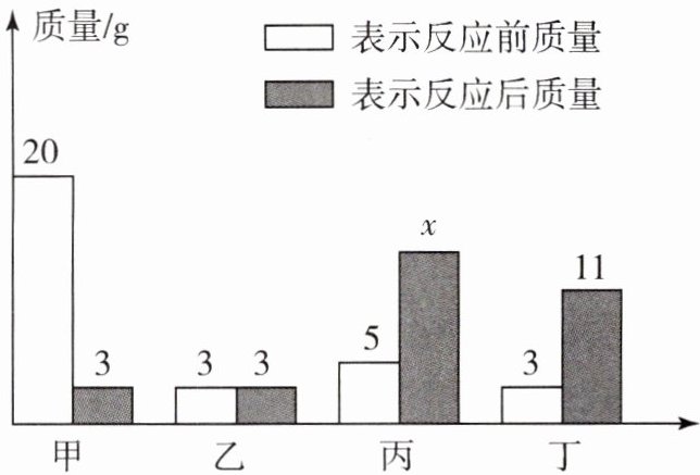C [解析]根据质量守恒定律,则有20+3+5+3=3+3+x+11,解得x=14,反应后质量增多的物质是生成物,质量减少的物质是反应物。甲反应后质量减少,是反应物,丙、丁的质量增加,是生成物,乙反应前后质量不变,可能是催化剂,也可能没有参加反应。由分析可知,甲是反应物,丙、丁是生成物,该反应符合"一变多"的特点,属于分解反应,A错误;乙反应前后质量不变,可能是催化剂,也可能没有参加反应,B错误;由分析可知,x=14,C正确;该反应中甲与丁的质量比为(20g-3g):(11g-3g)=17:8,因此生成11g丁,需消耗甲的质量是11g×17/8≈23.4g,D错误。