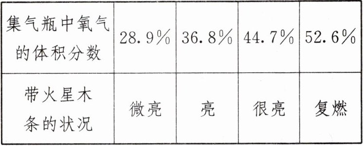 |集气瓶中氧气的体积分数|28.9%|36.8%|44.7%|52.6%|