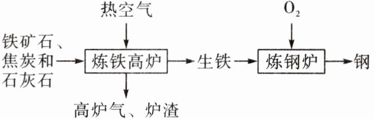 铁矿石、焦炭和石灰石$\xrightarrow []{热空气}生铁\xrightarrow []{O_{2}}$钢