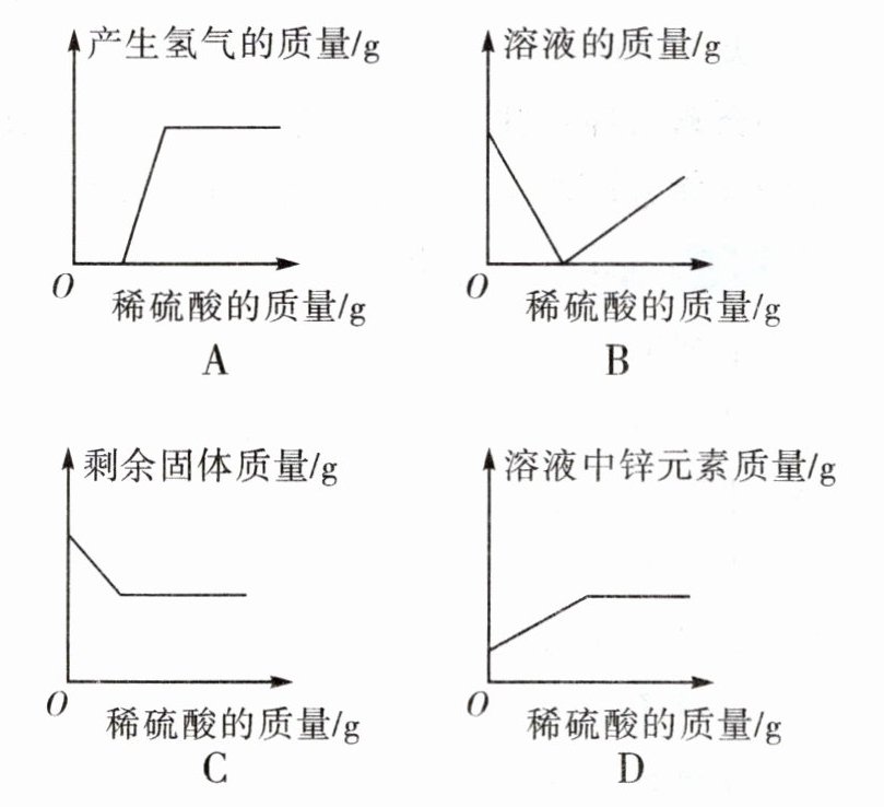 C [解析]加入稀硫酸,锌立即和稀硫酸反应生成氢气,A错误;锌和稀硫酸反应生成硫酸锌和氢气,随着反应进行,溶液质量增大,B错误;铜不能和稀硫酸反应,最终固体质量不是0,C正确;反应前溶液中锌元素质量是0,D错误。