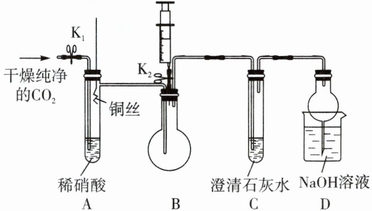 (3)当观察到C装置中澄清石灰水变浑浊时,则说明圆底烧瓶中已充满CO₂,此时可关闭K₁,让铜丝与稀硝酸发生反应,C装置中澄清石灰水与CO₂反应的化学方程式为Ca(OH)₂+CO₂=CaCO₃↓+H₂O。