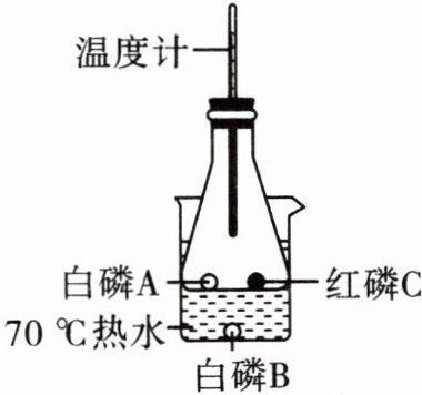 C [解析]70℃热水提供的热量达到了白磷的着火点,没有达到红磷的着火点,因此锥形瓶中的白磷燃烧,红磷不能燃烧,A错误;70℃热水的作用不仅有为锥形瓶提供热量,还起到隔绝空气的作用,B错误;白磷和红磷均与氧气接触,70℃热水提供的热量,达到了白磷的着火点,没有达到红磷的着火点,因此锥形瓶中白磷燃烧,红磷不能燃烧,因此由物质A与物质C可以说明燃烧需要温度达到着火点,C正确;白磷B虽然达到着火点,但是没有与氧气接触,不燃烧;红磷C与氧气接触,但是温度没有达到红磷的着火点,红磷不燃烧,故不能说明燃烧需要氧气,D错误。