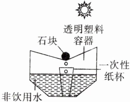 9 跨学科 自制净水器 某同学利用蒸馏的原理,设计了饮用水简易净化装置(如图),对非饮用水经阳光曝晒后进行净化。下列说法正确的是(
