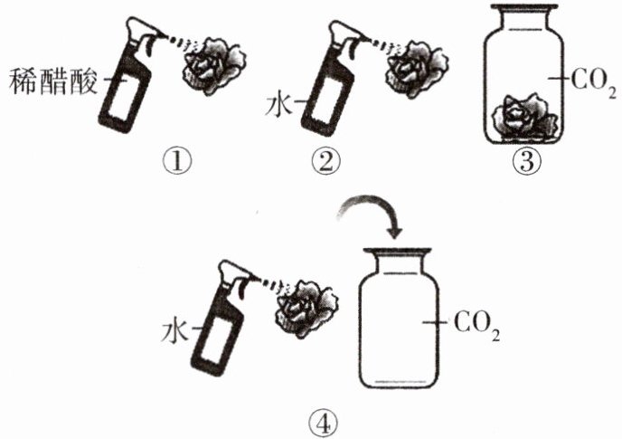 6.C [解析]二氧化碳能与水反应,也能溶于水,二氧化碳与水反应生成碳酸,酸性溶液使紫色石蕊溶液变红色。实验①中喷稀醋酸,④中生成了碳酸,都能使紫色石蕊变红色,A错误;实验④需要与实验③对照才能说明二氧化碳与水发生了反应,B错误;由实验①④推断,实验④中有酸性物质生成,C正确;实验②证明水不能使紫色石蕊变红色,D错误。