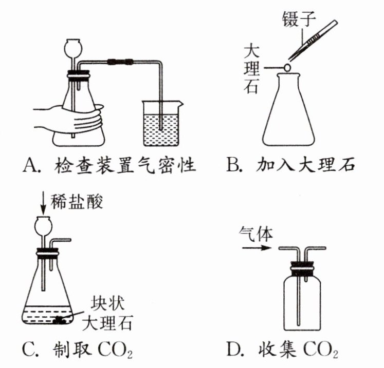 D [解析]该装置中的长颈漏斗与外界相通,没有形成密闭系统,无法用此方法检查该装置的气密性,A错误;向锥形瓶内添加块状固体时,应先将锥形瓶横放,用镊子将固体放在锥形瓶口,再慢慢将锥形瓶竖起,使其滑落至容器底部,B错误;该装置中的长颈漏斗下端没有伸入液面以下,会导致生成的二氧化碳从长颈漏斗中逸出,无法收集到二氧化碳气体,C错误;二氧化碳的密度比空气大,用图示装置收集二氧化碳时,二氧化碳应从长管通入,D正确。