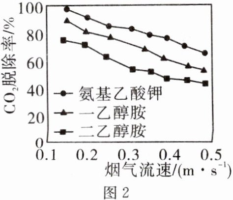 (4)对比图 2 中三条曲线,得出的结论是随烟气流速增大$,CO_2$脱除效果______(填“增强”或“减弱”),在实验研究的烟气流速范围内,当烟气流速相同时,______。