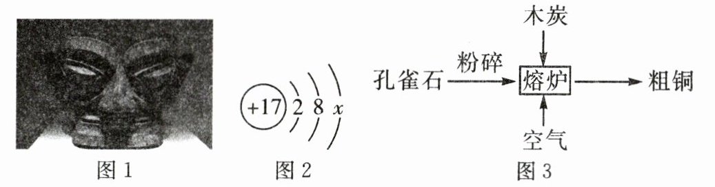 (2)变化:青铜制品初始颜色为金黄色,出土的青铜制品表面呈青绿色,主要成分为碱式碳酸铜,含少量氧化亚铜$(Cu_2O)、$氯化亚铜(CuCl)等。请标出氧化亚铜中铜元素的化合价: 。自然界中的氯离子对青铜制品有较大的破坏作用,如图2是氯离子的结构示意图,其中x= 。