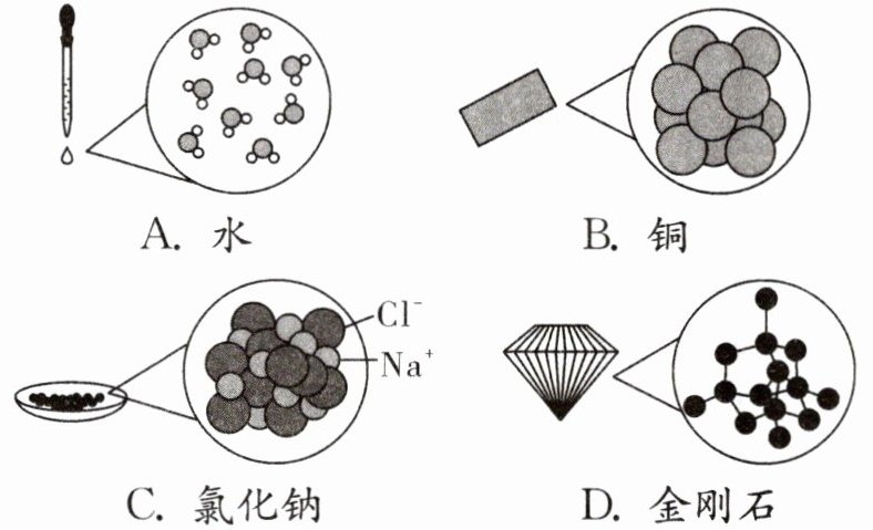 1.C [解析]氯化钠是离子化合物,由氯离子和钠离子构成,A不符合题意;金刚石是固态非金属单质,由碳原子直接构成,B不符合题意;干冰是固态二氧化碳,由二氧化碳分子构成,C符合题意;铁是金属单质,由铁原子直接构成,D不符合题意。