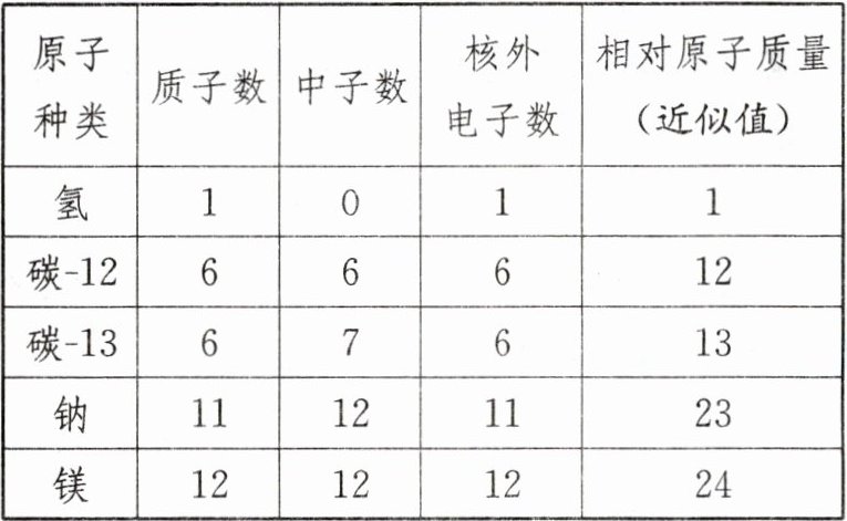 |原子种类|质子数|中子数|核外电子数|相对原子质量(近似值)|