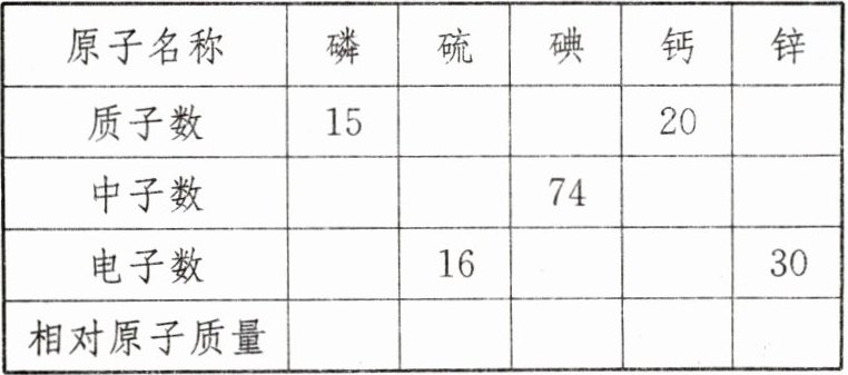 (4)原子名称 磷 硫 碘 钙 锌质子数 15 16 53 20 30中子数 16 16 74 20 35电子数 15 16 53 20 30相对原子质量 31 32 127 40 65