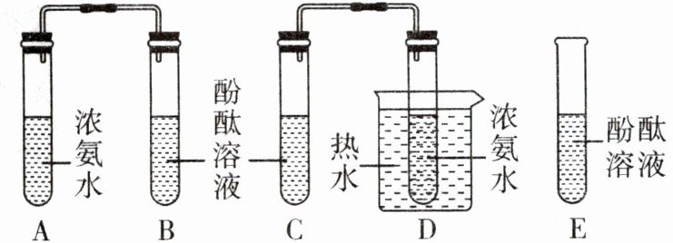(2)实验中观察到B、C试管内的溶液都变成红色,但C试管内液体变色速率较快,由此实验现象得出的结论是分子是不断运动的,温度越高分子运动得越快。实验二:分子在不停运动着,A正确;氨水能使酚酞溶液变红,盐酸不能使酚酞溶液变红,不同分子的化学性质不同,B正确;变红和不变色的酚酞溶液滴数不同,则不同分子的运动速率不相同,C错误;产生白烟的位置靠近蘸有浓盐酸的棉球,D正确。