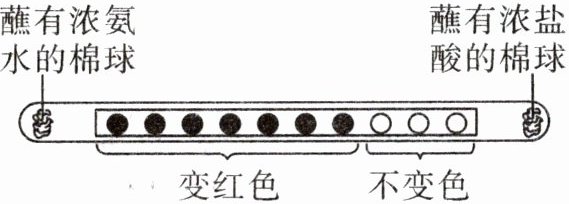 。实验二:取一滤纸条,等间距滴入10滴无色酚酞溶液装入玻璃管中,然后从玻璃管的两端同时放入分别蘸有浓氨水和浓盐酸的棉球,并迅速封闭两端管口,很快可观察到管内有白烟产生,待白烟消失后还可观察到如图所示的现象。(已知浓氨水和浓盐酸都具有挥发性,并且浓氨水能使酚酞溶液变红,浓盐酸则不能)