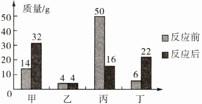 D [解析]由图中数据分析可知,反应前后甲的质量增加了32g-14g=18g,故甲是生成物,生成的甲的质量为18g;同理可以确定丙是反应物,参加反应的丙的质量为50g-16g=34g;丁是生成物,生成的丁的质量为22g-6g=16g;乙的质量不变,可能作该反应的催化剂,也可能没有参加反应。该反应的反应物为丙,生成物是甲和丁,属于分解反应,A错误;乙的质量不变,可能作该反应的催化剂,也可能没有参加反应,B错误;该反应中,甲、丁的质量变化之比为18g:16g=9:8,C错误;丙是分解反应的反应物,一定是化合物,D正确。