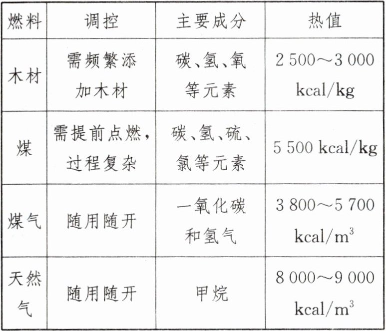 |木材|需频繁添加木材|碳、氢、氧等元素|2500~3000kcal/kg|