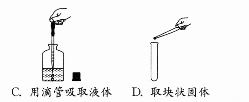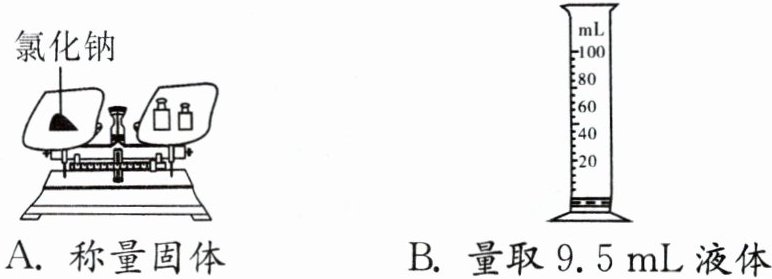 A [解析] 使用托盘天平时被称量物放在左盘,砝码放在右盘,A正确;量取9.5 mL的液体应选取量程为10 mL的量筒,B错误;用胶头滴管吸取液体时应先捏住胶头,挤压出空气,再插入被吸液体中,C错误;向试管中装块状固体药品时,先将试管横放,用镊子把块状固体放在试管口,再慢慢将试管竖立起来,D错误。