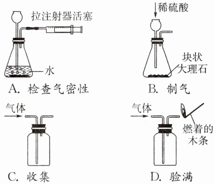 C [解析]碳酸钠和盐酸反应速率过快,气体不易收集,所以一般不选用,A正确;二氧化碳能溶于水,故不能用排水法收集,B正确;将燃烧的木条平放在集气瓶口,检验二氧化碳是否收集满,不能伸入集气瓶中,C错误;实验室制取二氧化碳和利用过氧化氢制取氧气的装置相同,因为都是固液常温型反应,D正确。