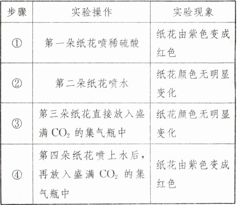 |④|第四朵纸花喷上水后,再放入盛满 $CO_{2}$ 的集气瓶中|纸花由紫色变成红色|