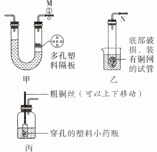 B [解析]根据图示可知,装置甲中左侧液面高于右侧液面,说明此时容器内右侧大气压大于外界大气压,A正确;此时装置甲中固体与液体分离,反应停止,说明止水夹M处于关闭状态,B错误;装置乙N处添加止水夹,当打开止水夹,固、液接触,反应发生,当关闭止水夹,试管中压强增大,液面下降,固、液分离,反应停止,因此装置乙N处添加止水夹可以与装置甲具有相同功能,C正确;当把粗铜丝向上提起时,穿孔的塑料小药瓶与溶液脱离,反应停止,当把粗铜丝向下移动时,穿孔的塑料小药瓶与溶液接触,反应发生,因此装置丙具有可控制反应进行或停止的功能,D正确。