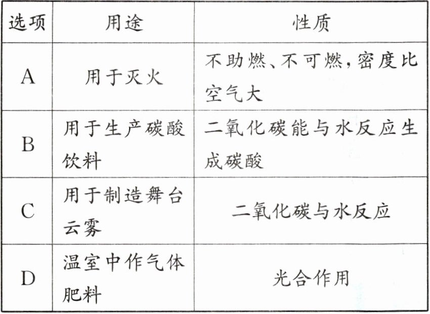 C [解析]二氧化碳的密度比空气大,不可燃、不助燃,可用于灭火,A正确;二氧化碳与水反应生成碳酸,可用于生产碳酸饮料,B正确;固态二氧化碳易升华吸热,可用于制造舞台云雾,C错误;二氧化碳是光合作用的原料,可用作温室中的气体肥料,D正确。