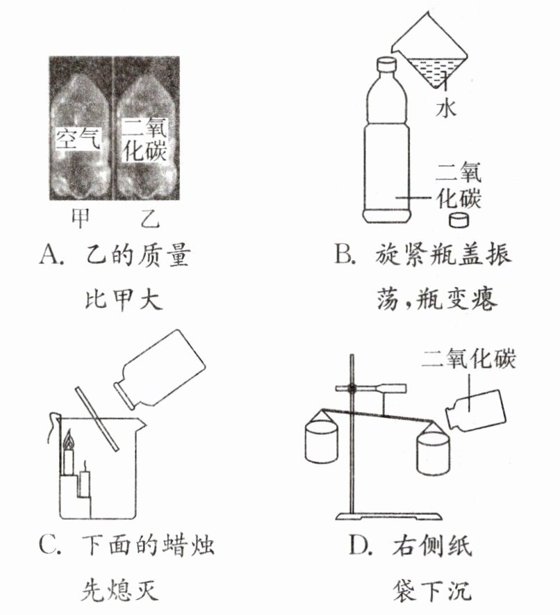 B [解析]相同条件下,同体积塑料瓶内二氧化碳的质量大于空气的质量,A正确;振荡后塑料瓶变瘪的原因是二氧化碳溶于水,瓶内气体压强减小,在外界大气压的作用下,塑料瓶变瘪,但不能说明同体积的二氧化碳质量比空气大,B错误;实验中观察到低处的蜡烛先熄灭,高处的蜡烛后熄灭,说明二氧化碳的密度比空气大,即相同条件下,同体积的二氧化碳的质量比空气的质量大,C正确;实验中观察到倾倒二氧化碳的一侧纸袋下沉,说明同体积的二氧化碳质量比空气大,D正确。