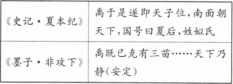 A [解析]根据材料“禹于是遂即天子位”“国号曰夏后”“禹既已克有三苗”可知,禹建立了夏朝,在继位后,征伐作乱的三苗,稳定统治。因此,通过材料中的文献资料可以了解夏朝的建立和巩固。故选A项。