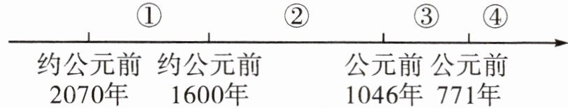 B [解析]图中②处对应的时间是商朝时期。结合所学知识可知,受战乱、环境变化等因素的影响,商朝曾多次迁都,到商王盘庚时迁徙到殷。故选B项。
