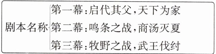|剧本名称|第一幕:启代其父,天下为家第二幕:鸣条之战,商汤灭夏第三幕:牧野之战,武王伐纣|